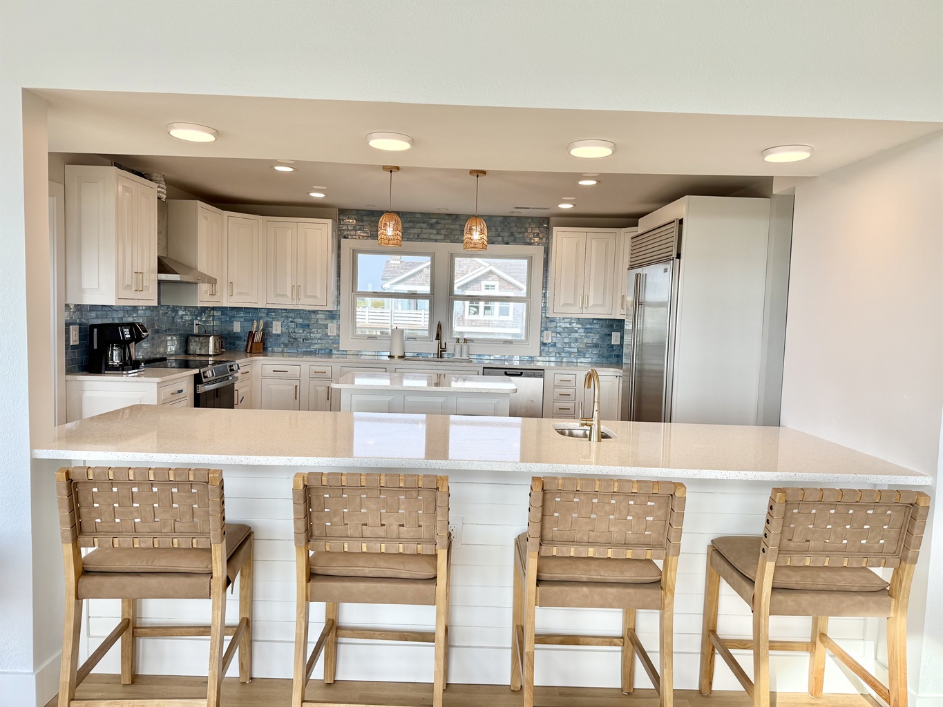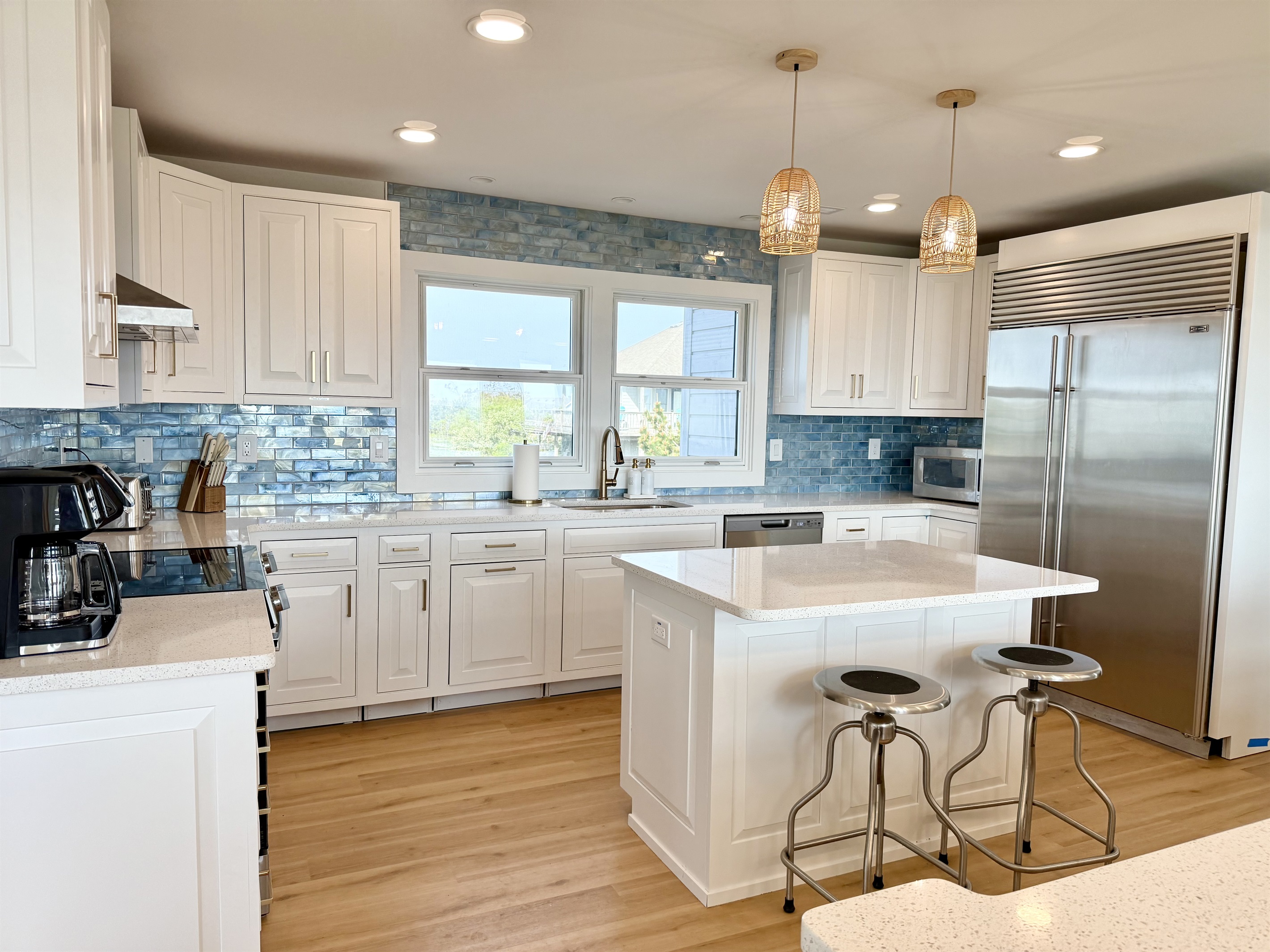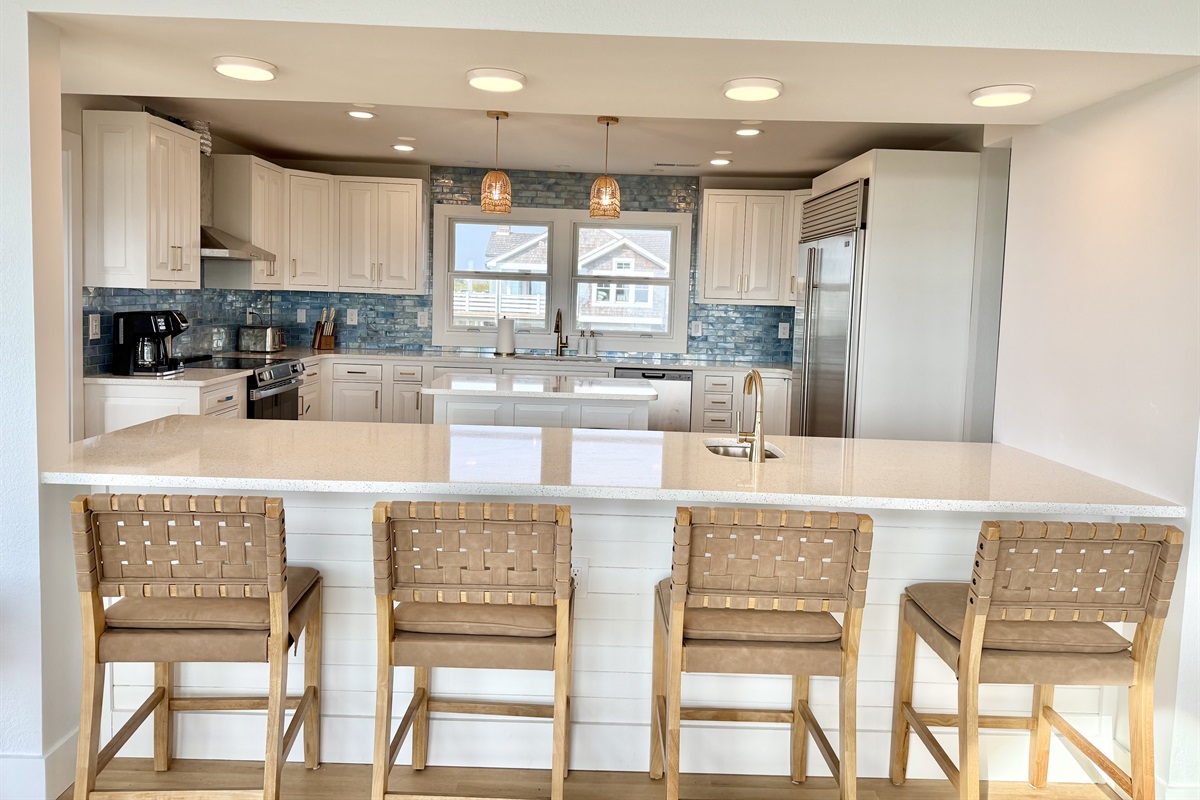 - Kitchen with Sub-Zero refrigerator, dishwasher, electric stove/oven, microwave, large sink, wine fridge, drink fridge, fully stocked with quality cookware and kitchenware. Enjoy ocean views from the kitchen