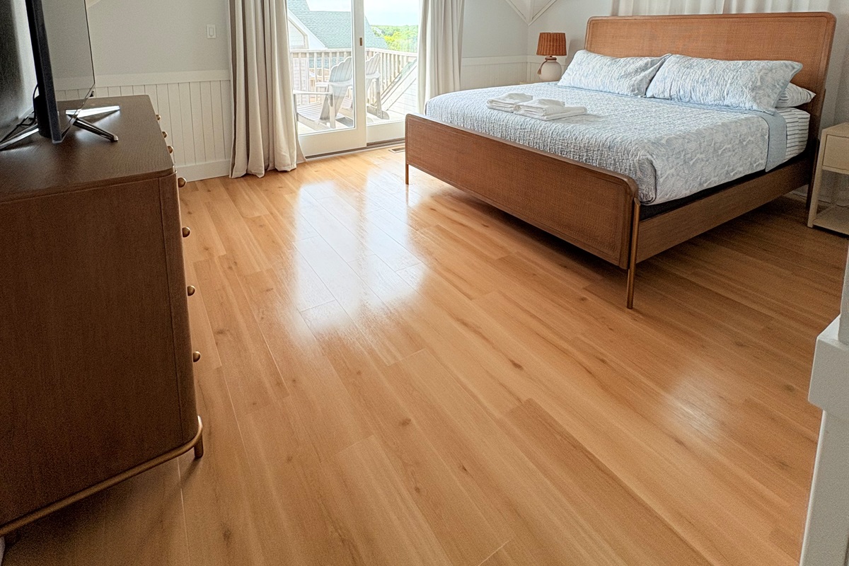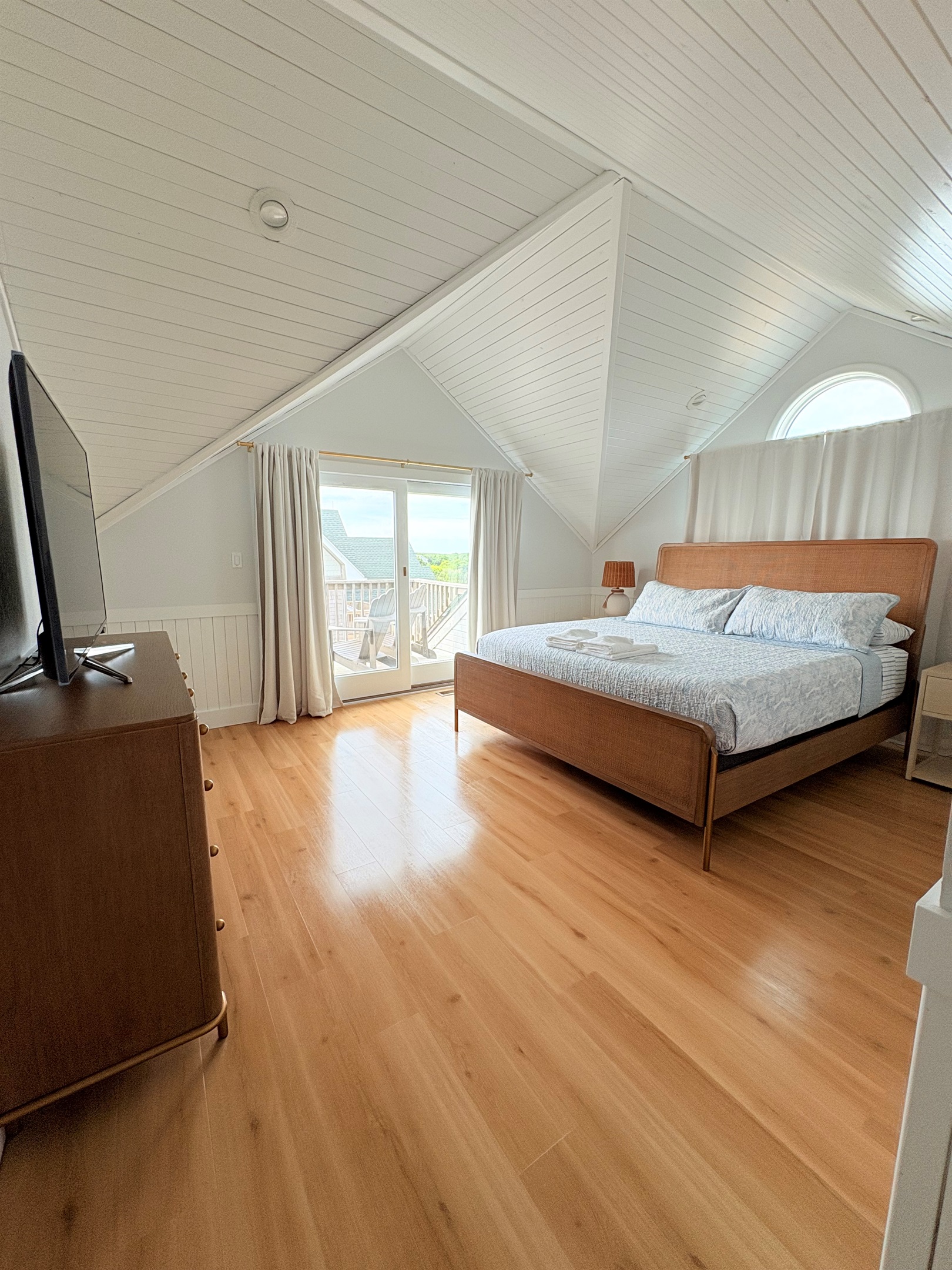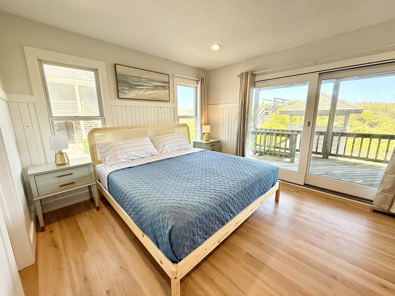 - Bedroom #1: luxury king mattress with 100% cotton sheets, large closet, blackout curtains, 50" ROKU Smart HDTV, walkout access to back deck, leading to beach walkway and outdoor shower Double. Leads to the Shared Bathroom.
