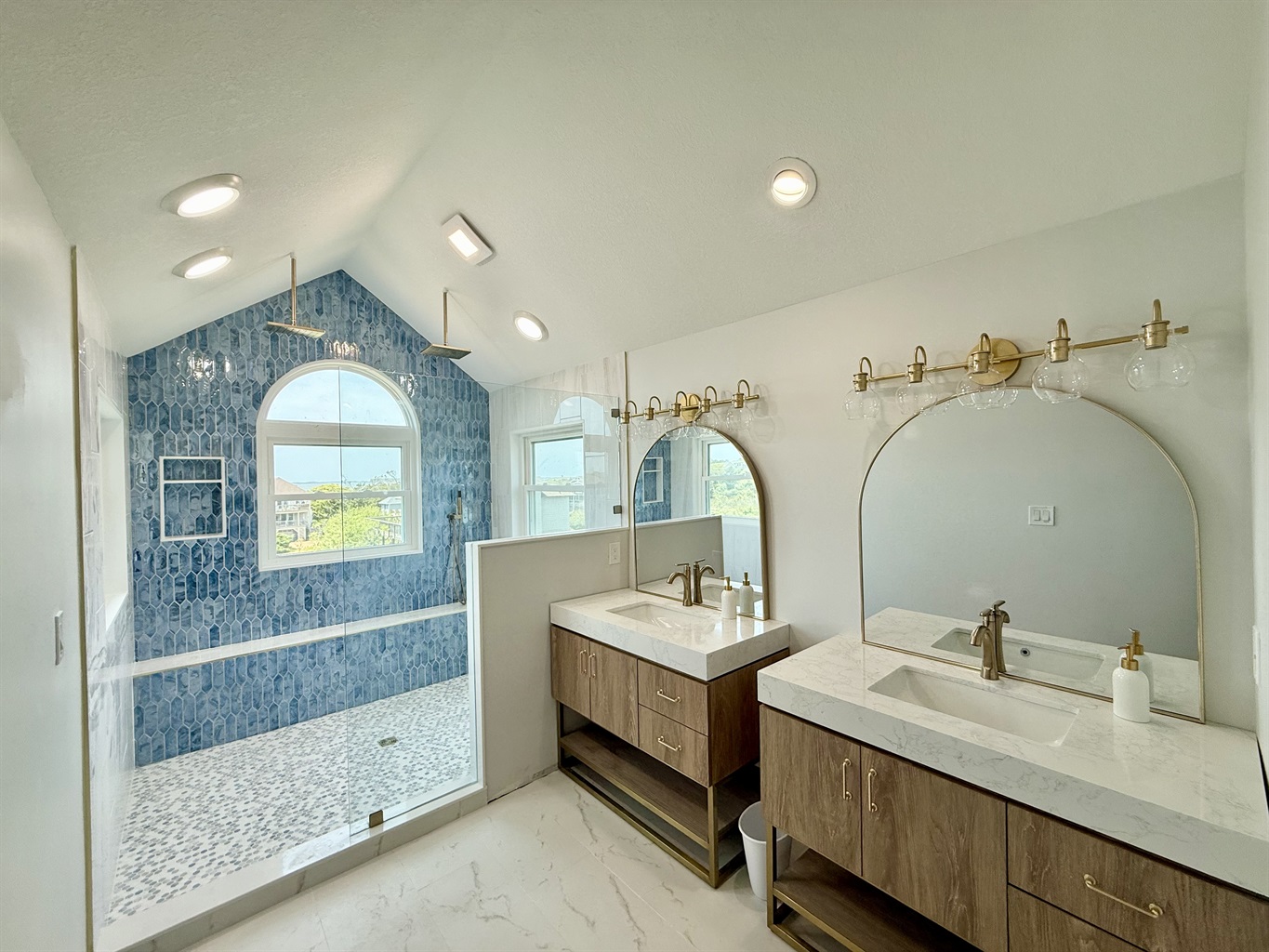 - Master Bathroom: Large, walk-in, double rain head shower with a hand sprayer, tiled from floor to ceiling with glass doors accented in gold; large bench. Large double vanity with tons of counter space, linen closet, large closet inside bathroom area, and a separate water closet for soft close toilet.