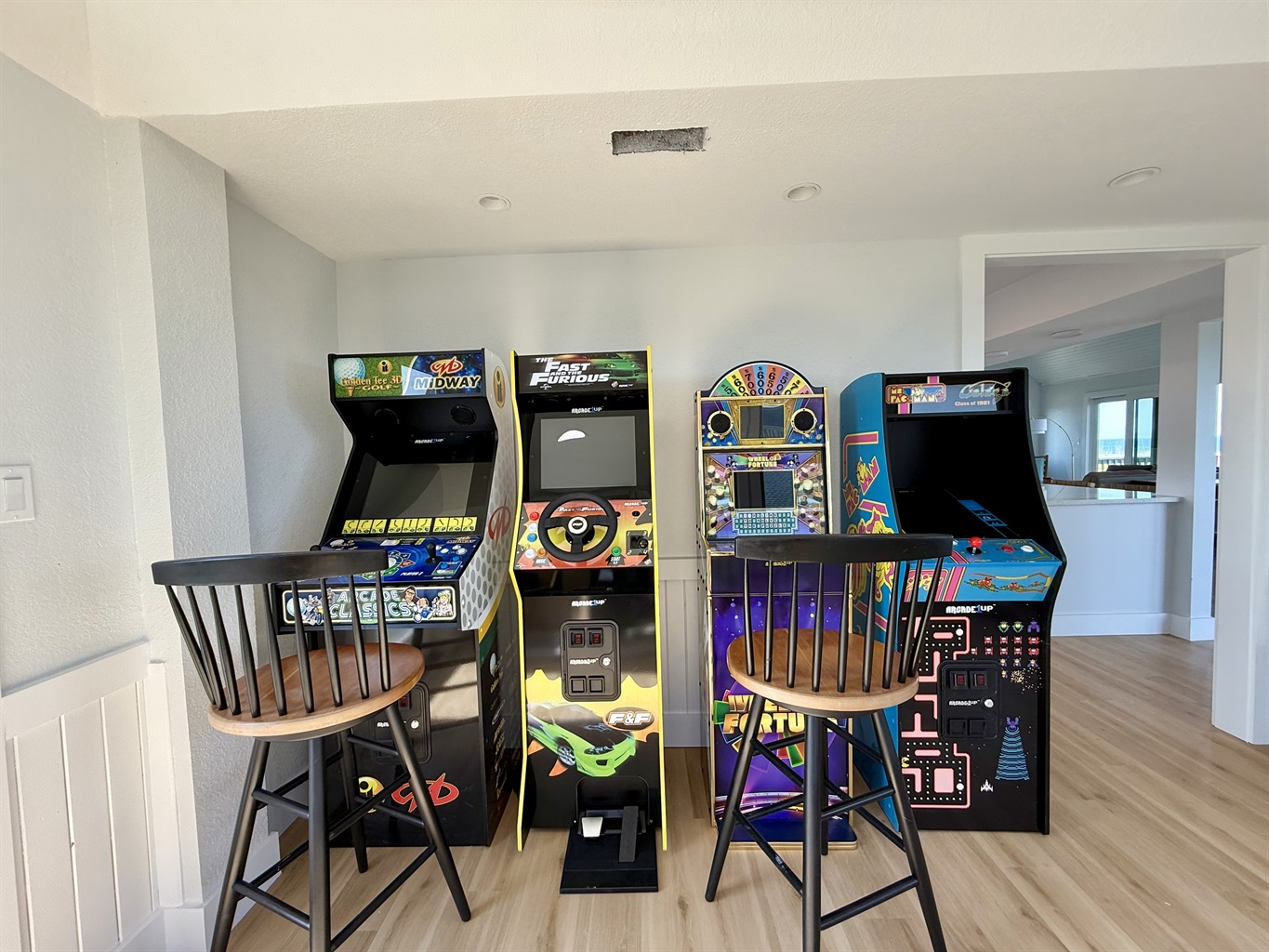 âGame Room with shuffleboard, game/book closet, and several arcades, including Golden Tee, Fast and Furious, Wheel of Fortune, and Ms. Pac-Man.