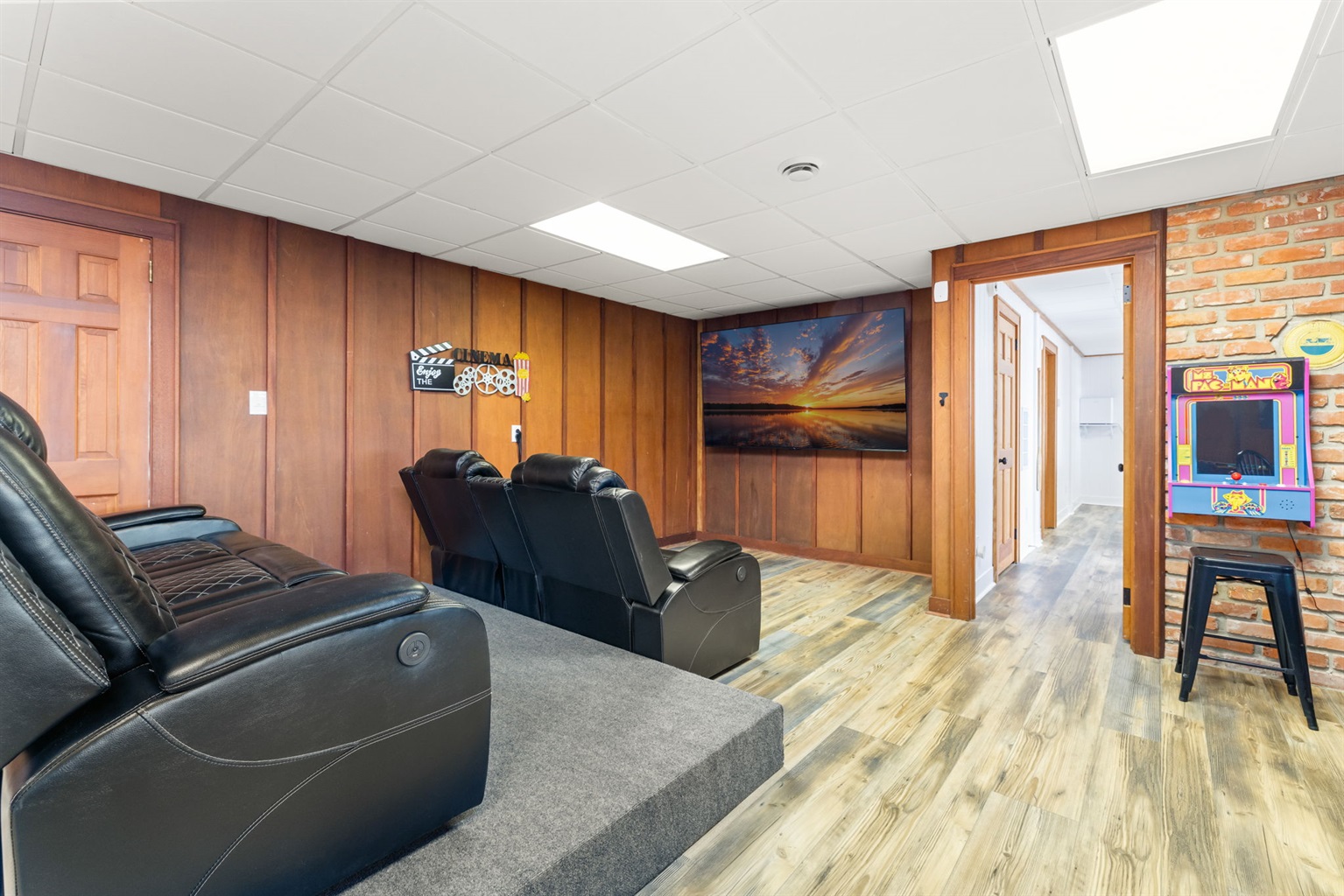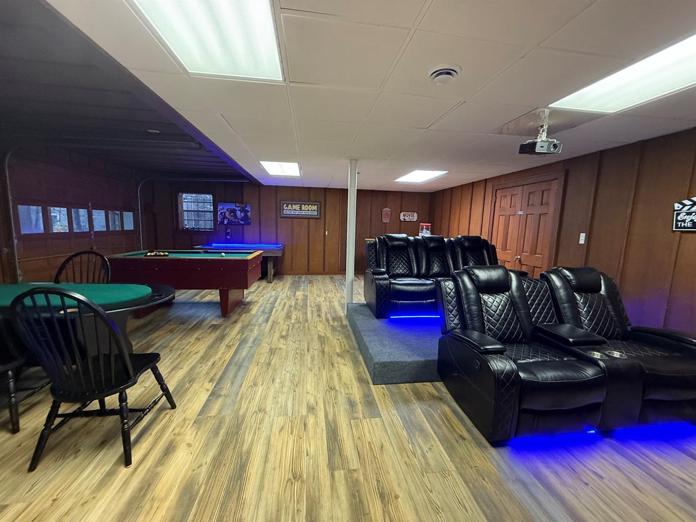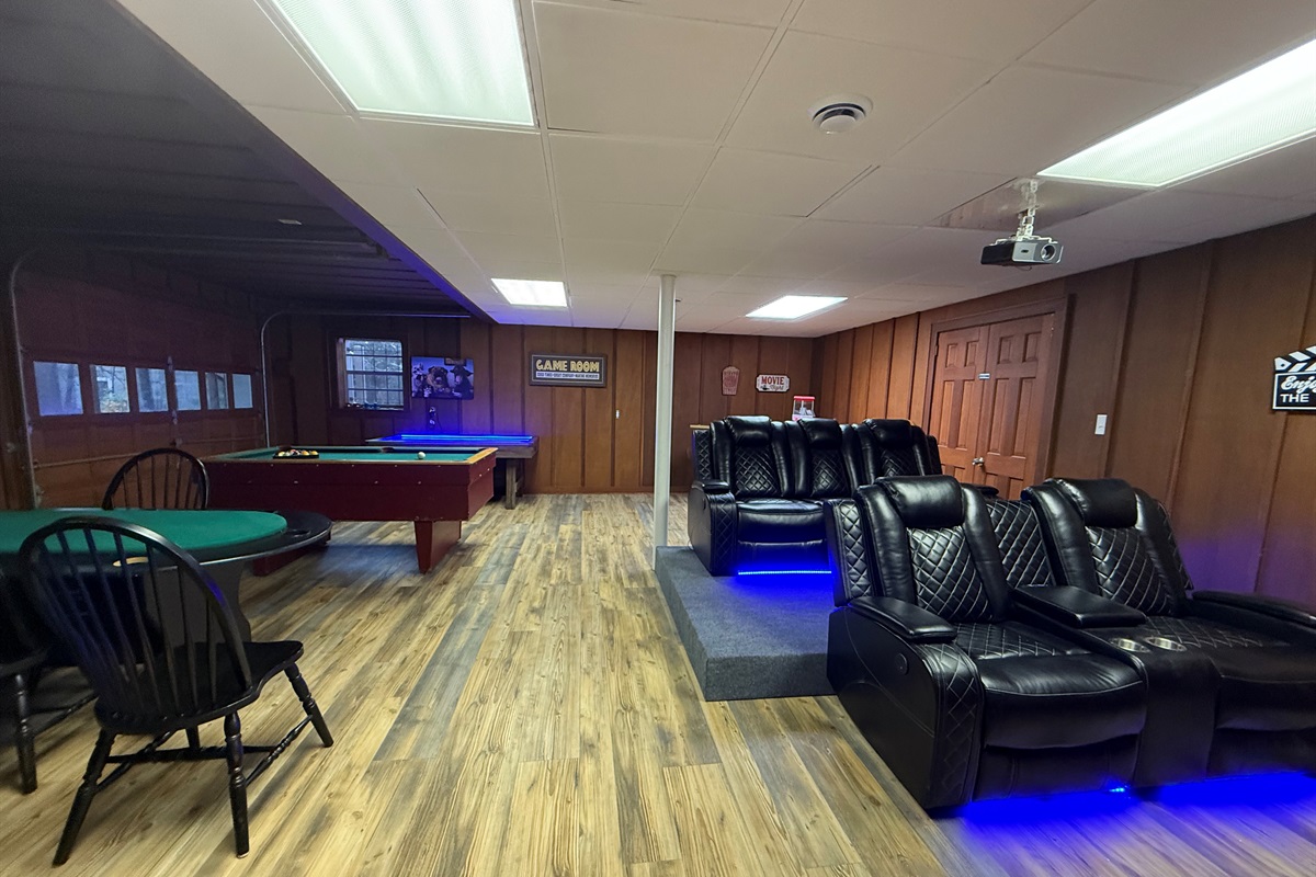 - Movie Theater area: 85" ROKU TV with stadium-style leather reclining seats